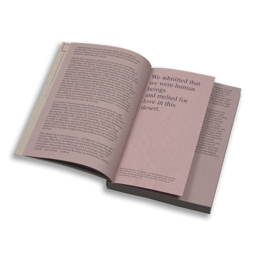 This magazine – which serves as the reader for Sonic Acts Biennial 2026, Melted for Love – departs from this question, reimagining home not as a physical structure, but as a site of invitation, attentiveness, and care. Unfurling over its pages are the voices of artists, writers, and researchers who shape the Biennial programme, offering depth and orientation, with particular emphasis on the Symposium at the Stedelijk Museum, the multi-gallery exhibition, and the live concerts.